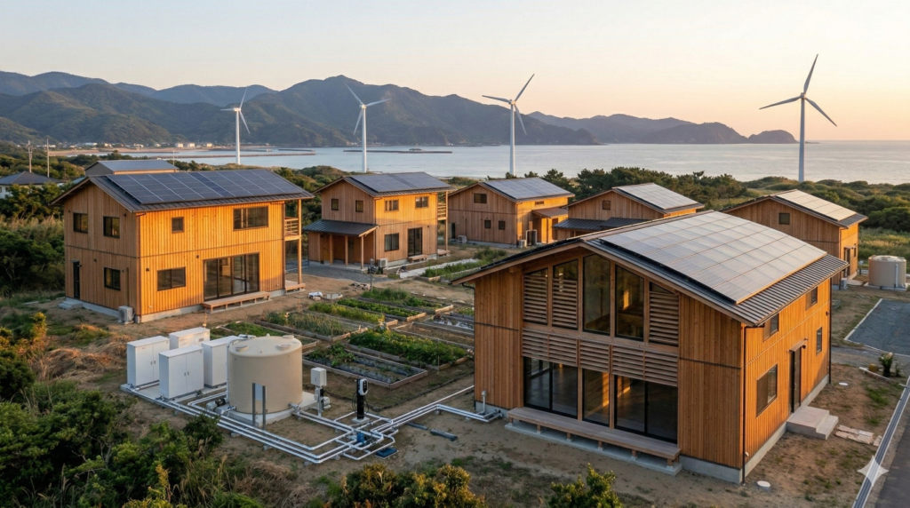 • 自然エネルギーの活用: 太陽光発電や風力発電の導入、また太陽の熱や光をコントロールするパッシブデザインの採用。