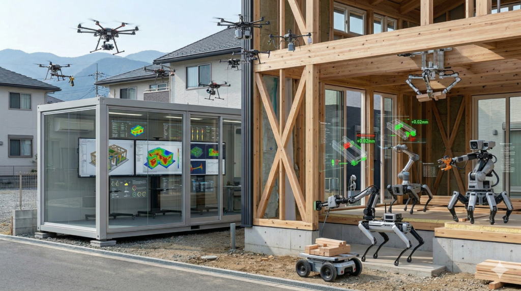 デザイン段階では、AIアルゴリズムが顧客の要望(動線、日当たり、収納量など)を学習し、何万通りものパターンから最適なレイアウトを提案します。これにより、個人の感性に依存しすぎない、論理的で美しい住空間が実現します。